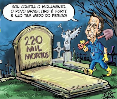 Bolsonaro não perde uma chance de negar a gravidade da doença –apenas uma gripezinha, que já está no finalzinho– protestar contra o uso de máscaras e o isolamento social, provocando aglomerações por onde passa, atacar os governadores que zelam pela saúde das suas populações e pregar a reabertura total do comércio.