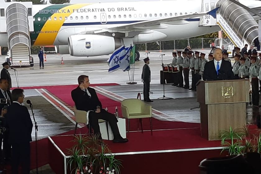 O próximo passo foi a revista conjunta das tropas de Israel. Depois de examinar os armamentos de um dos militares, as autoridades presentes, de ambos os países, foram cumprimentadas e Netanyahu fez o primeiro discurso. Apesar de a expectativa ser de um pronunciamento em inglês, ele falou apenas em hebraico. Bolsonaro falou na sequência. Ambos se pronunciaram por cinco minutos.