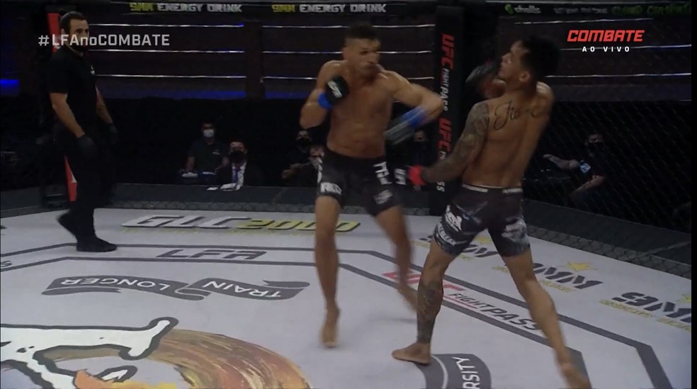 Rodrigo Lídio (centro) acerta o cruzado de esquerda que derrubou Arthur Lima (dir.) no LFA 111 — Foto: Reprodução