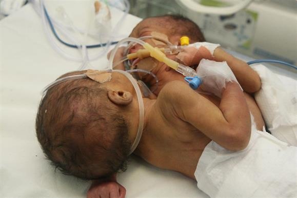 Sobre a gémea siamesa ainda viva, que permanece na incubadora, os médicos não adiantam cenários positivos, dada a impossibilidade de separação.