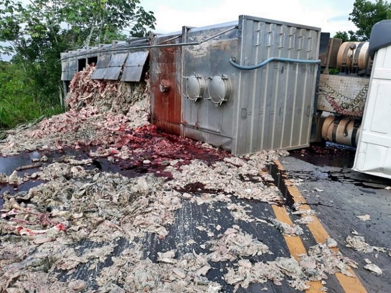 Um caminhão de uma empresa frigorífica de Cacoal (RO), município da Zona da Mata, tombou na BR-364, próximo do trevo de acesso ao distrito Estrela de Rondônia, em Presidente Médici, município da região Central do estado.