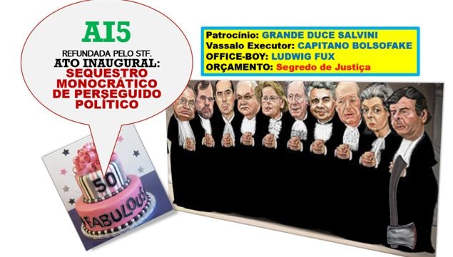 A ordem de prisão dada por Luiz Fux às 21:00 de ontem é uma perfeita celebração do 50º aniversário da AI5. Aliás, como todos os que envelhecemos, esta nova versão da AI5 é ainda mais arbitrária, cruel e totalitária que a daquela época, pois, pelo menos, aquela tinha formulação jurídica, e todo mundo sabia que sob ela podia ser feita qualquer arbitrariedade. Esta não, é uma nova modalidade: AI5 pelas costas…