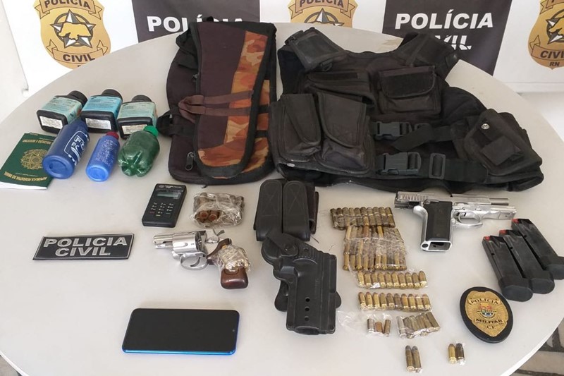 Armas de fogo, munições e distintivos da polícia do Ceará foram recolhidos pela polícia nos locais alvos da operação.
