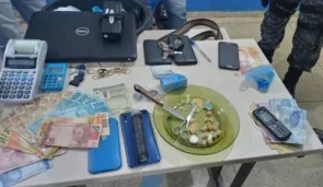 Também foram encontradas porções aparentando ser pasta base de cocaína com 3,8 gramas; uma porção aparentando ser pasta base de cocaína com 106,4 gramas; um invólucro de substância vegetal aparentando ser maconha, com 2 gramas; uma calculadora modelo “contábil” e a quantia de R$ 1.447,00 em espécie; além de um notebook e uma máquina para pagamentos com cartões de créditos, entre outros. A. P. S. negou que vendia drogas, porém, entrou em contradições sobre os produtos localizados.