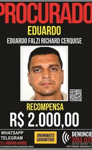 Uma recompensa de R$ 2.000 é oferecida por informações que levem à prisão de um dos suspeitos de participar do ataque à sede do canal Porta dos Fundos, no Humaitá, zona sul do Rio de Janeiro. Eduardo Falzi Richard Cerquise, de 41 anos, é considerado foragido da Justiça após não ter sido localizado em uma operação da Polícia Civil.