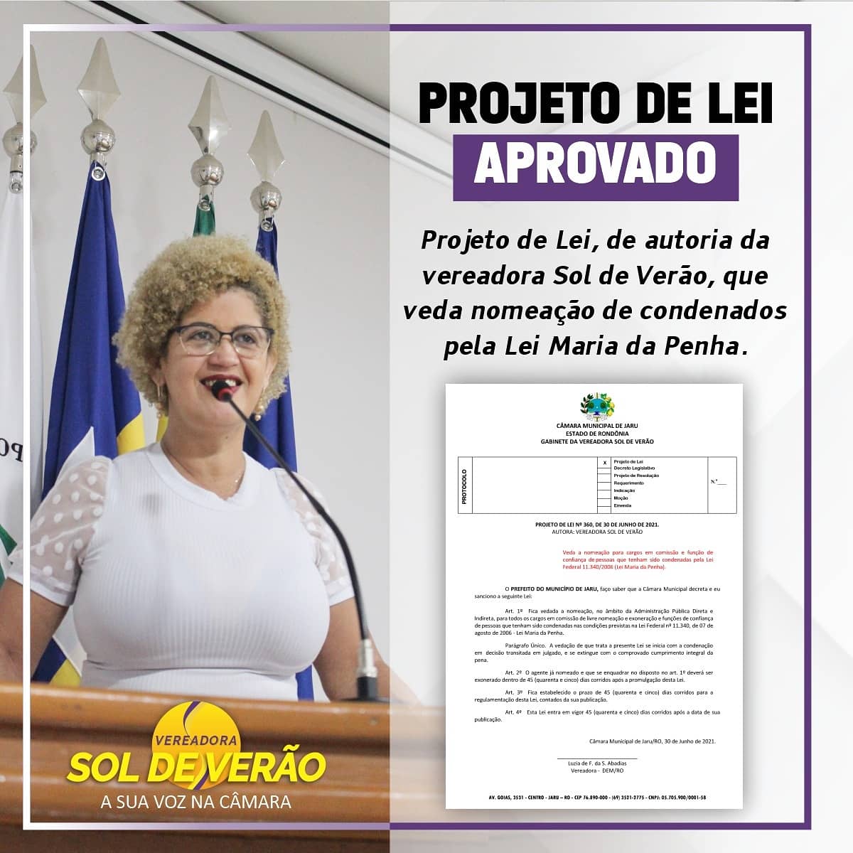 Um projeto de Lei de autoria da vereadora Sol de Verão (DEM), que visa impedir a nomeação de condenados pela Lei Maria da Penha em cargos em comissão e função gratificada foi aprovado pela Câmara Municipal de Jaru em sessão extraordinária realizada nesta quarta-feira (21).