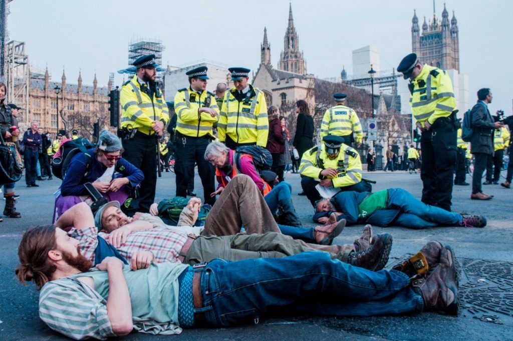 No final da tarde de quinta-feira (18), manifestantes bloqueando as principais vias da praça do Parlamento (Big Ben) foram abordados por um pelotão de policiais solicitando a remoção dos cartazes e a liberação das ruas. Alguns integrantes do movimento deitaram no chão convidando os demais a integrar a ação. “Estou aqui para indicar as consequências das mudanças climáticas e da perda de biodiversidade no planeta. Isso significa que a sociedade está colapsando. (…) Nós podemos reverter isso se trabalharmos juntos. Se não, estamos falando sobre centenas de milhões de mortes.”, afirma Possmett, ex-paraquedista deitado na avenida que foi preso alguns minutos após a entrevista.