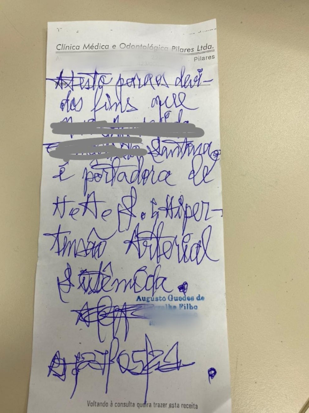 "O atestado precisa chegar aqui [no conselho]. Não adianta falar. Precisa ter um elemento material. Quem tem o atestado é quem recebeu. E quem recebeu está incorrendo em crime, está se beneficiando. A única alternativa é se alguém roubar o atestado e trouxer aqui. E eu duvido que aconteça isso. Você não tem outro elemento. Você tem uma cumplicidade entre quem pegou o atestado e quem emitiu."