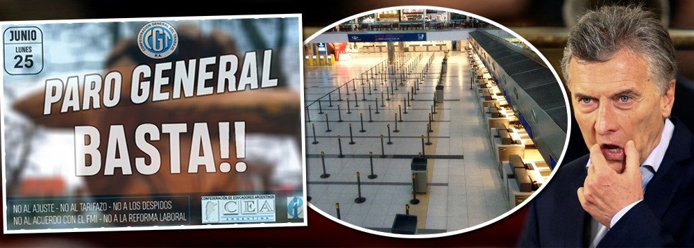 Greve liderada pela CGT tem participação de todas as centrais sindicais e movimentos sociais. Tudo para nesta segunda (25) na Argentina; governo Macri sob pressão total. País está sem transportes e aeroportos não funcionam. É a terceira greve geral contra a política econômica de Mauricio Macri, que quebrou o país, e começou às 0h. Principais alvos da greve são as insuportáveis taxas de juros e a liquidação das reservas do país, que levaram a Argentina novamente ao FMI, o aumento das tarifas públicas, o arrocho salarial e o desemprego. O peso já perdeu 30% de seu valor desde abril. Pesquisas indicam que, pela primeira vez, se as eleições fosse hoje, Macri perderia para a ex-presidente e senadora Cristina Kirchner. Segundo pesquisa do Grupo de Opinião Pública realizada em junho, Cristina venceria Macri em eleições por 36% a 30%.