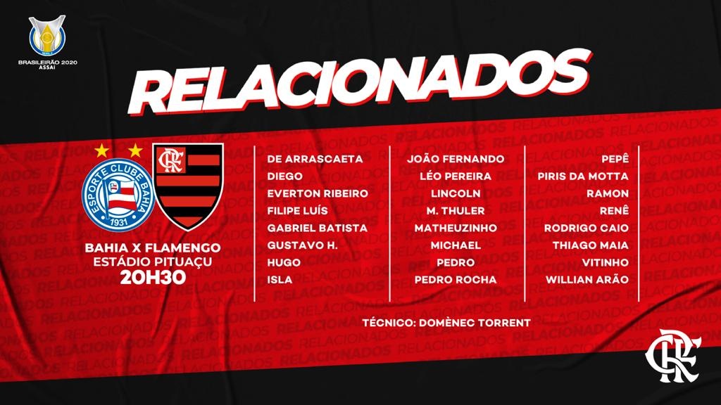 O Flamengo enfrenta o Bahia, nesta quarta (02), às 20h30, no Pituaçu. A partida é válida pela 7ª rodada do Campeonato Brasileiro. O Rubro-Negro realizou os últimos treinamentos na manhã desta terça (01) e viaja para Salvador nesta tarde. Como exposto por Domènec Torrent, o rodízio no elenco será algo comum daqui para frente. Sem Gabigol e Gerson, o técnico catalão divulgou a lista de relacionados para encarar o Tricolor Baiano.