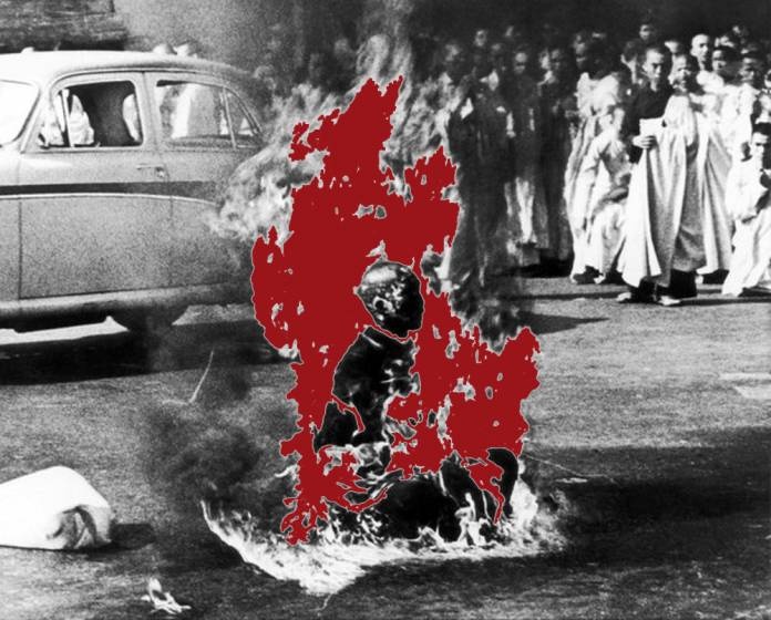 “Duc se sentou placidamente sobre a almofada e adotou a posição de lótus – usada para momentos de meditação – em meio à multidão. Em seguida, um dos monges despejou o conteúdo sobre a cabeça de Duc que, nesse momento, apenas se pôs a manipular as contas de oração que tinha nas mãos e a recitar uma prece. Então, diante dos olhos de todos, riscou um palito de fósforo e começou a queimar.” (A foto que mostra o monge em chamas foi captada pelo fotógrafo Malcolm Browne e colorizada por mim.)