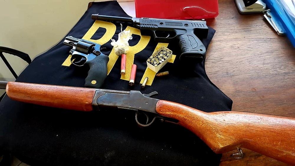 Conforme a PRF, os suspeitos demonstraram nervosismo durante a abordagem. Na revista ao veículo, os policiais encontraram um revólver de calibre 38, com ocorrência de roubo, uma espingarda calibre 36 e uma pistola de pressão alterada para o calibre 22 e 51 munições.