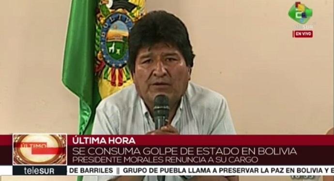 Domingo, 10 de novembro, se decreta um golpe de Estado na Bolívia. Inicia com a quarta reeleição da dupla de candidatos do Movimento ao Socialismo (MAS)-IPSP (Instrumento Político pela Soberania dos Povos). Deixo aqui a crítica, explícita, de que o MAS/IPSP teria, necessariamente, de indicar novos candidatos e assim quebrar o ciclo de concentração de poder, algo que, evidentemente, fortalece a posição dos partidos à direita e ligados ao imperialismo mais tacanho. Ocorre justo o oposto.