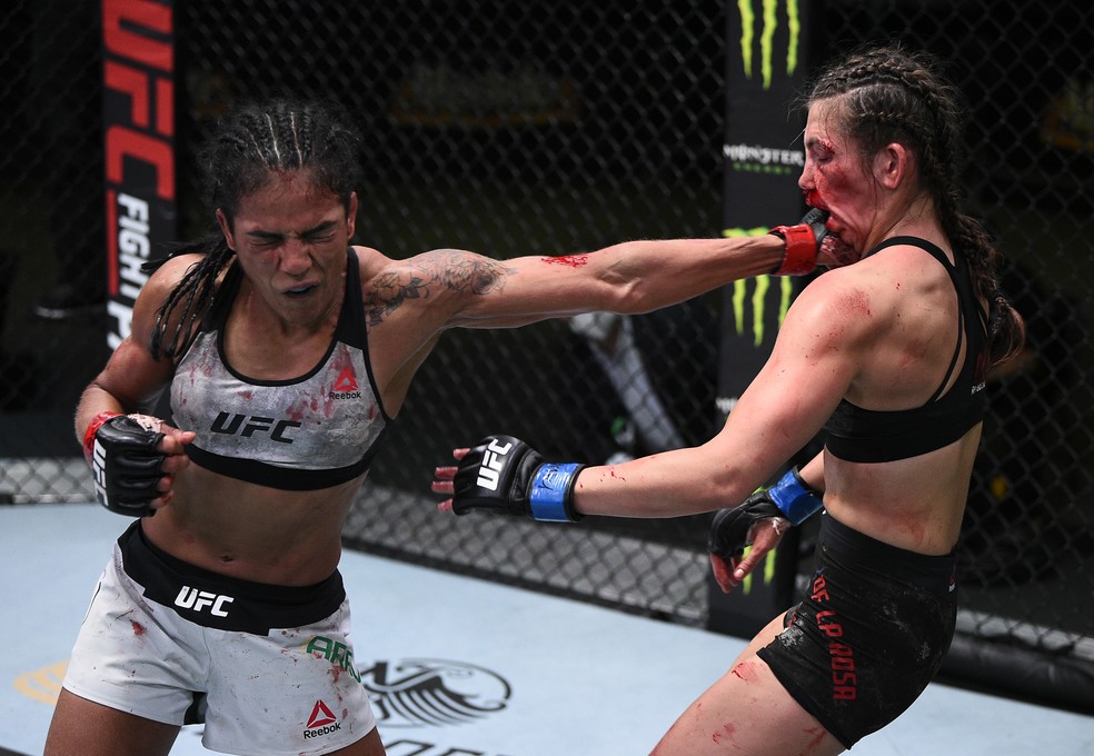 Viviane Araújo golpeia Montana de la Rosa em sua vitória no UFC Overeem x Sakai — Foto: Getty Images