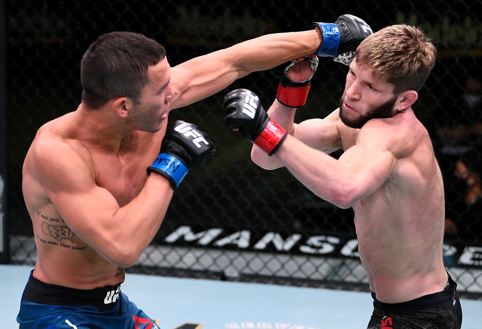Hunter Azure golpeia Cole Smith na sua vitória por pontos na abertura do UFC Overeem x Sakai — Foto: Getty Images